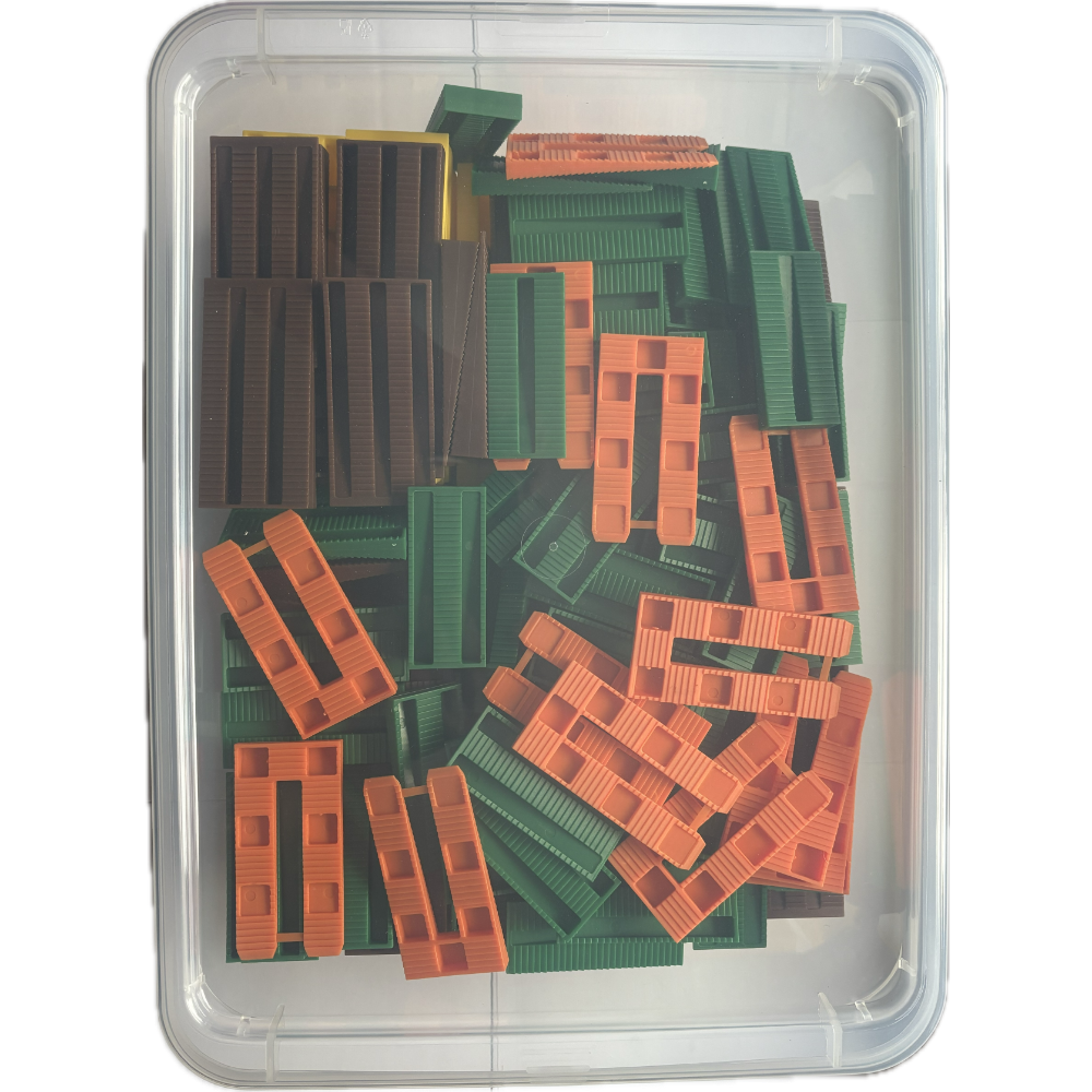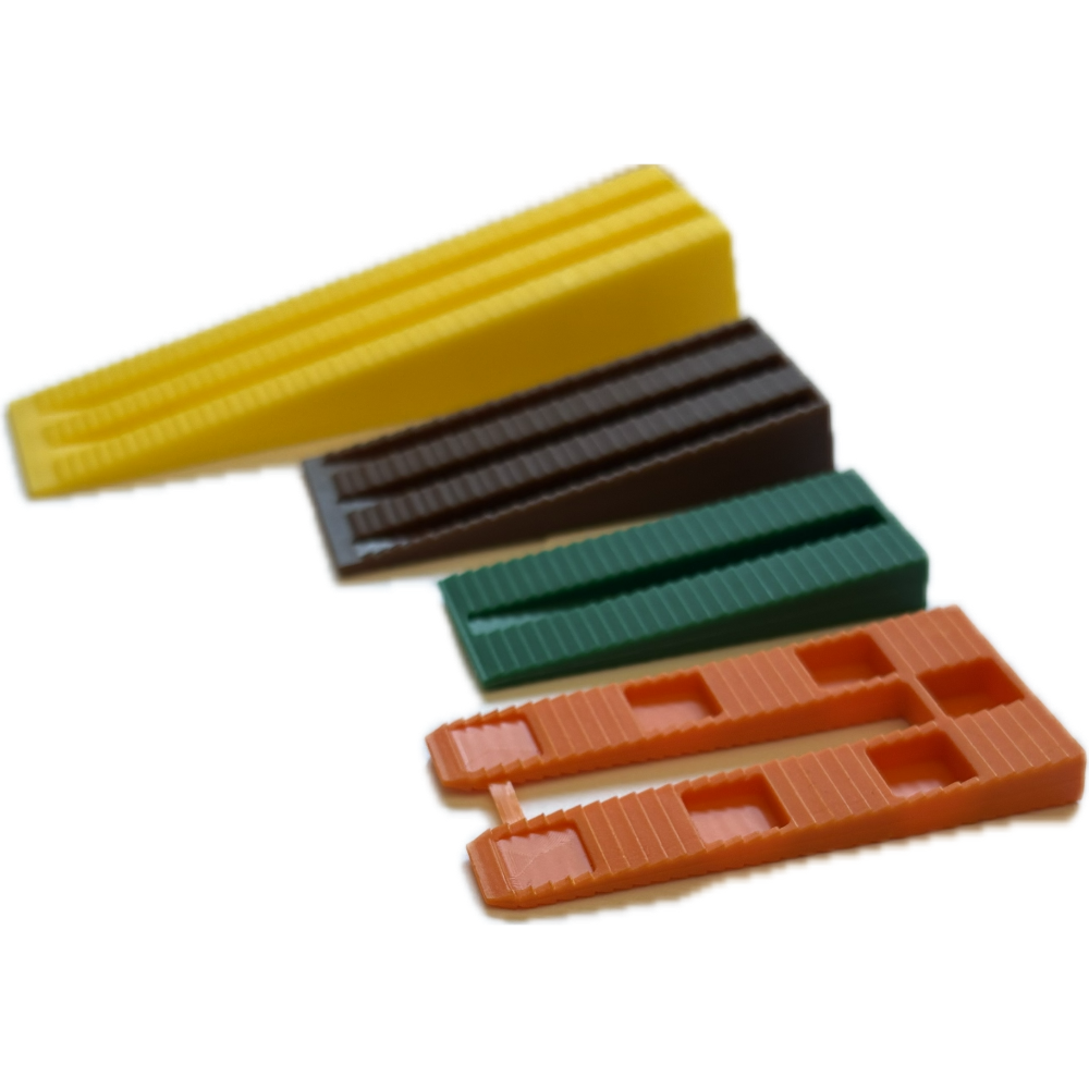 Kilar i 4 olika storlekar tillv. i formsprutad PP, slitstarka, lätta och återvinningsbara. Används för att skapa exakta mellanrum,justera nivåer och stabilisera byggkomponenter. Kan monteras ihop då taggar hakar i motsvarande hål, vilket ökar stabiliteten och underlättar montage.